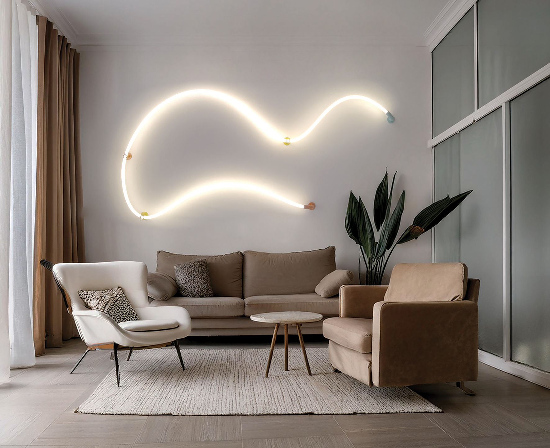 Un esempio particolare di utilizzo delle finiture colorate è il nuovo il sistema di illuminazione Anaconda. Questo innovativo sistema da parete, plafone e sospensione è caratterizzato dalla modellabilità del corpo tubolare in silicone e dalla luce diffusa e confortevole a 360 gradi. Anaconda offre una gamma di elementi personalizzabili, sia nella forma che nel colore, permettendo di creare soluzioni luminose su misura per ogni ambiente. Flessibile e dinamica, Anaconda è tutte le configurazioni che desideri: non una ma 100.000. La luce disegna lo spazio e lo rende accogliente grazie alla dinamicità del sistema stesso. I colori definiscono aree di spazio modellate dalla luce stessa.