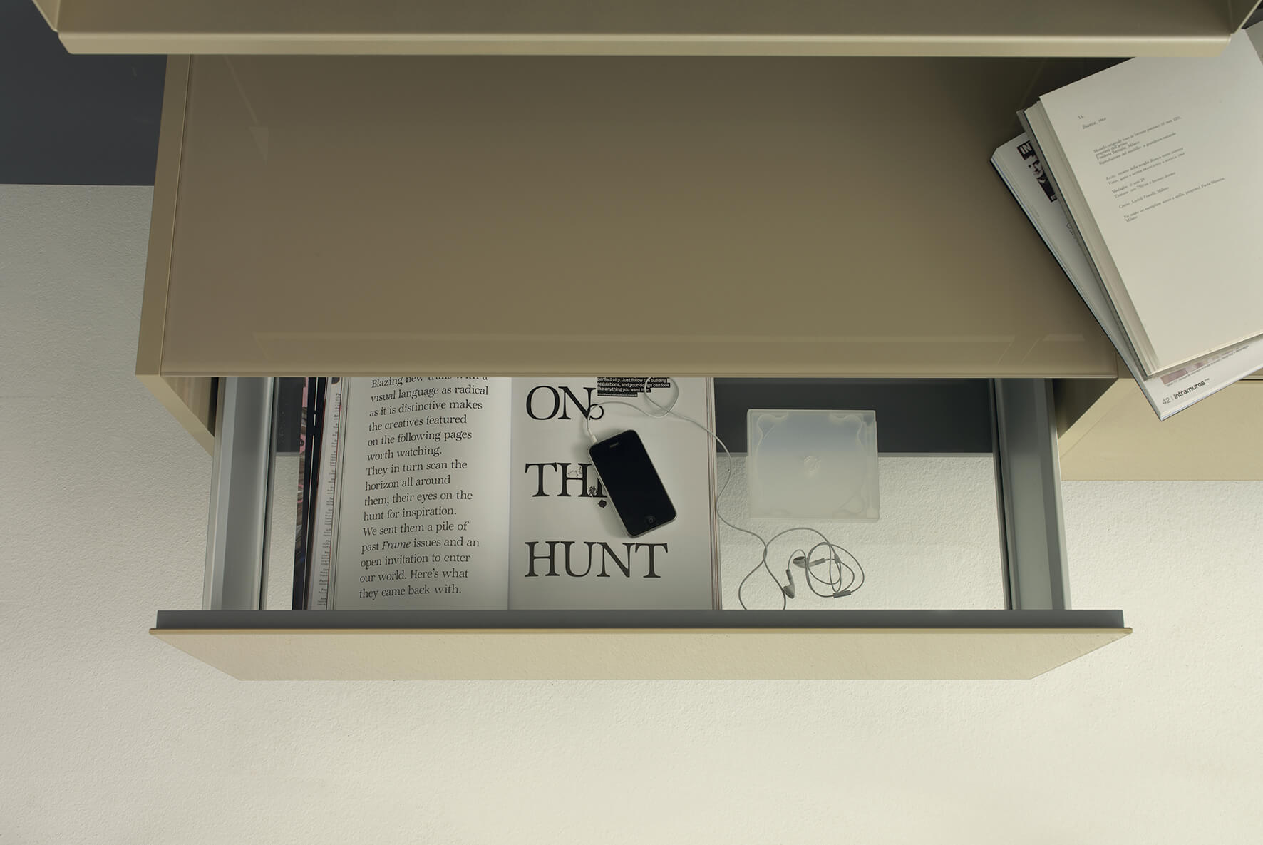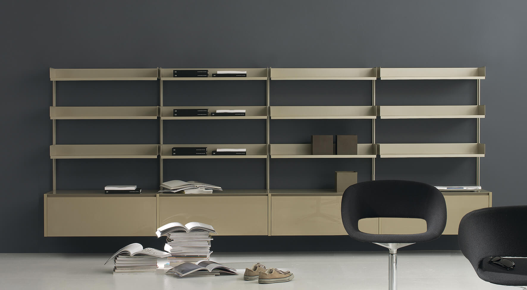 Gianobox storage units, with doors or drawers with innovative glass bottom, are available in different sizes and finishes. They combine harmoniously with the folded, powder-coated aluminium shelves, creating a balance between aesthetic lightness and constructive solidity. In particular, the horizontal groove profile of the doors and drawer fronts allows them to open smoothly and easily, emphasising the purity of the lines and the minimalist design, while the closing mechanism is softened.