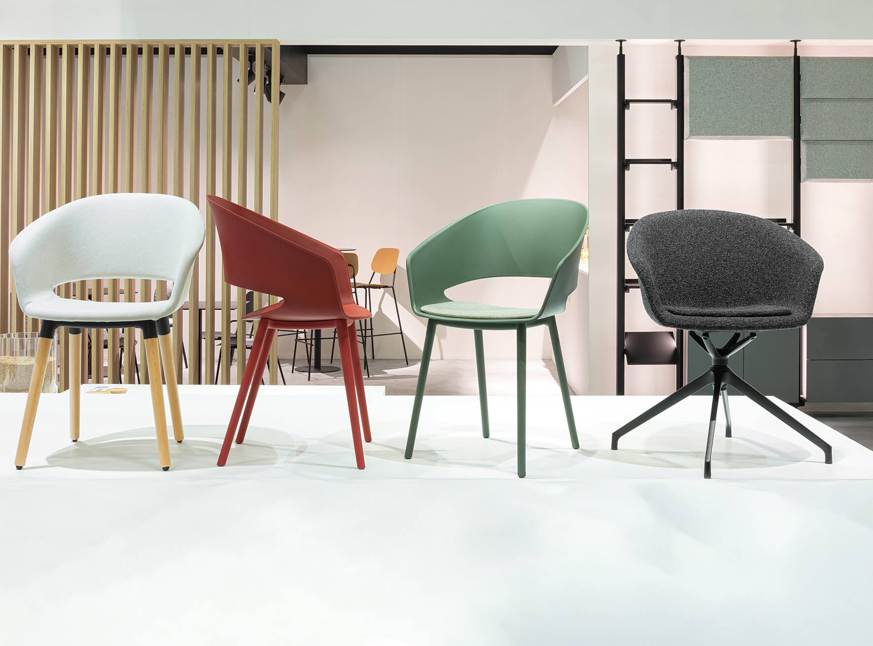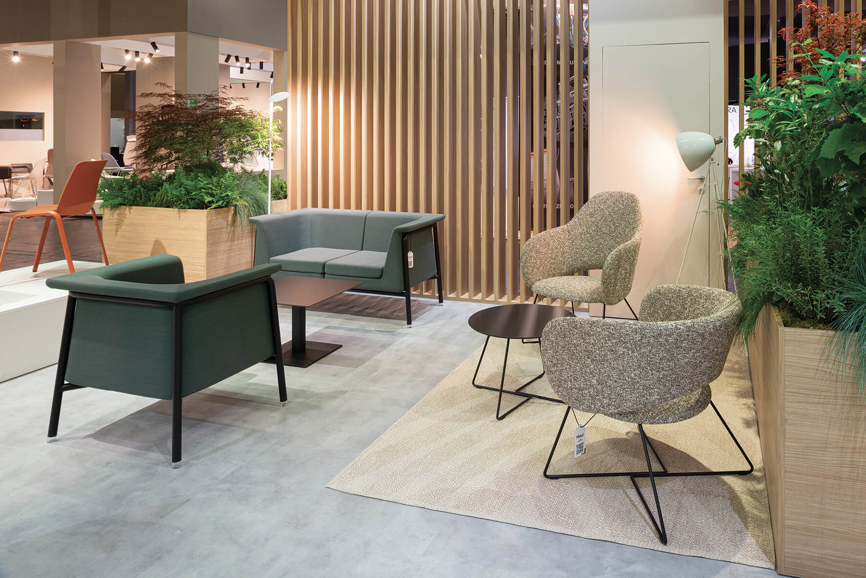 Natural materials, a soothing color palette, and a clear, intuitive spatial organization allowed visitors to immerse themselves in the different contexts of use of the exhibited collections, from contract to living, from community to co-working and educational environments, fully grasping the character and potential applications of Alba’s products.
