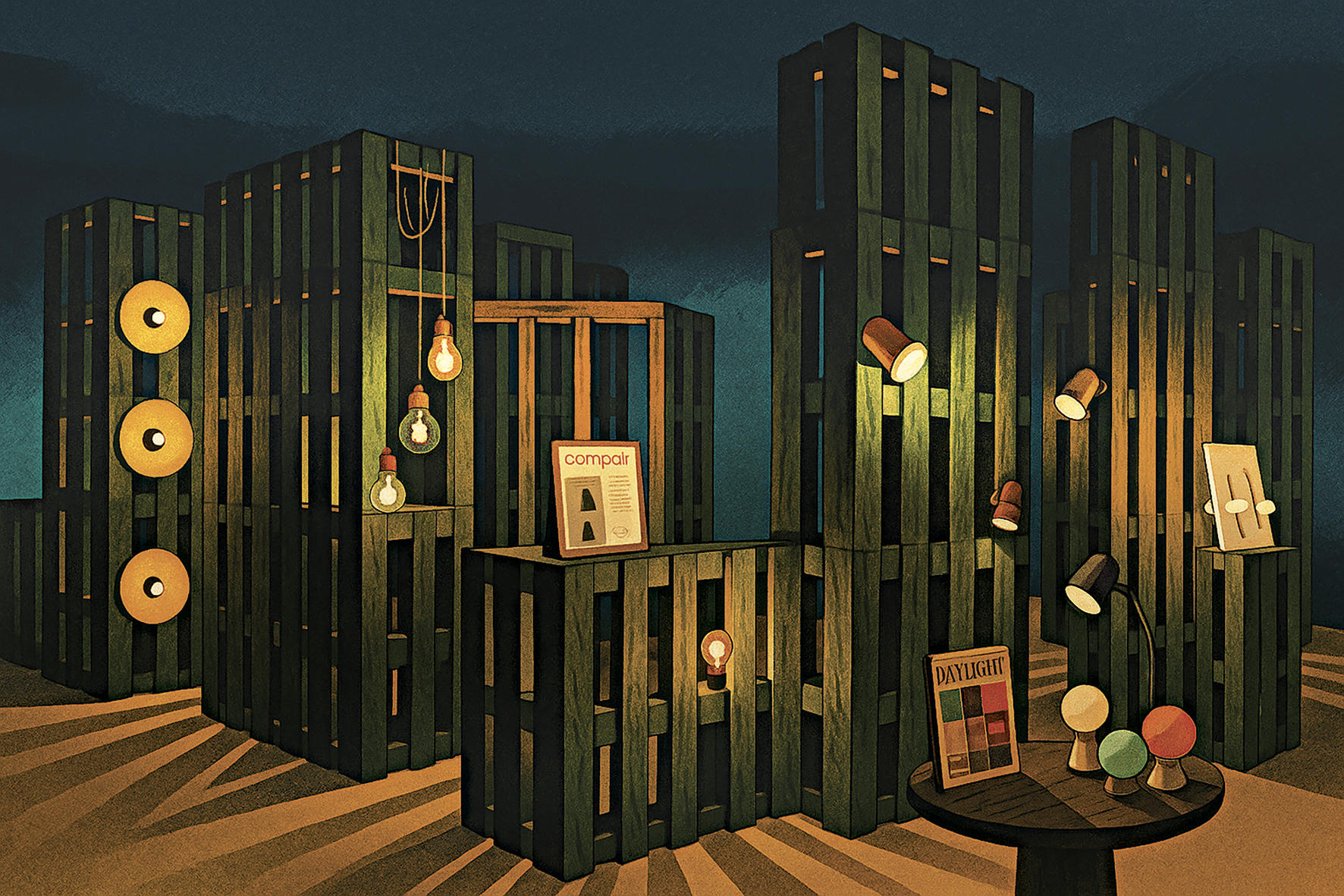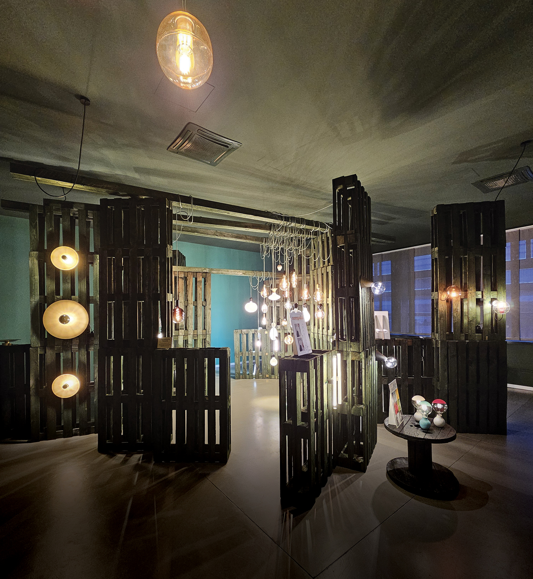 The showroom unfolds through two complementary dimensions: The inner area, a “shell” containing a multitude of different and combinable light sources, designed to be displayed, replaced, and related. In this space, the bulbs are the true protagonists, observed in their essence, purity, and expressive potential. The outer area is an ideal city built from stacked wooden pallets that become metaphorical “palaces.” From the gaps between the pallets, the light from the inner shell filters through, creating evocative plays of light and shadow on the walls and floor. The raw, imperfect texture of the wood contrasts with the elegance and refinement of the light sources, enhancing their beauty.