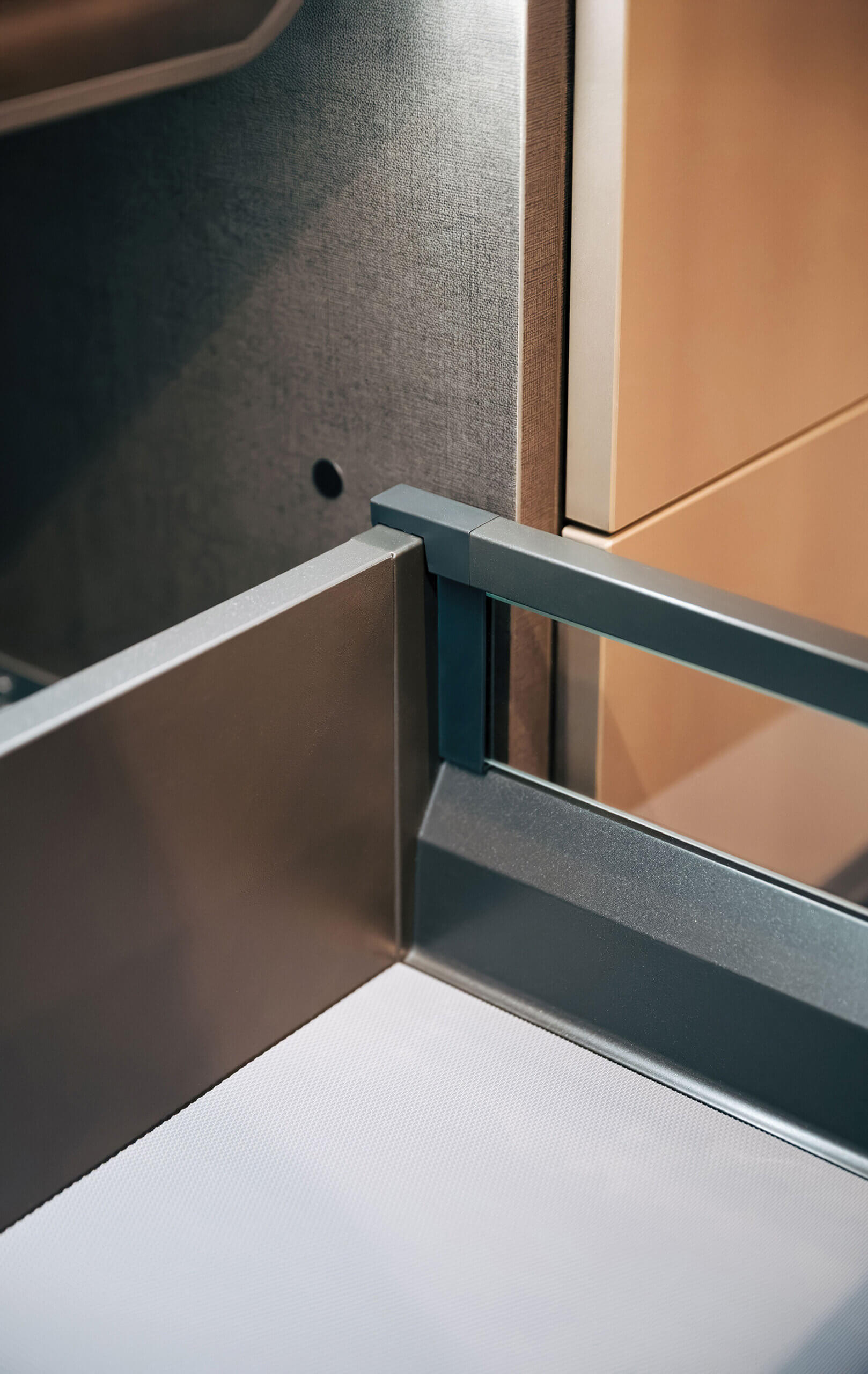 It is available in versions with partial or full-extension runners and can be equipped with comfort technologies such as OneTouch and SlowMotion for a practical and silent user experience. The drawer is made of double-wall steel and has a load capacity of 25/30/50 kg according to the slide configuration. It is available in Roccia grey and Neve white finishes. It offers a wide range of depths from 270 to 550 mm and four different heights: H100, H150, H180, and H210. Vertical and horizontal adjustment is made possible by the front fixing mechanism, while the decorative trim can be customised.
