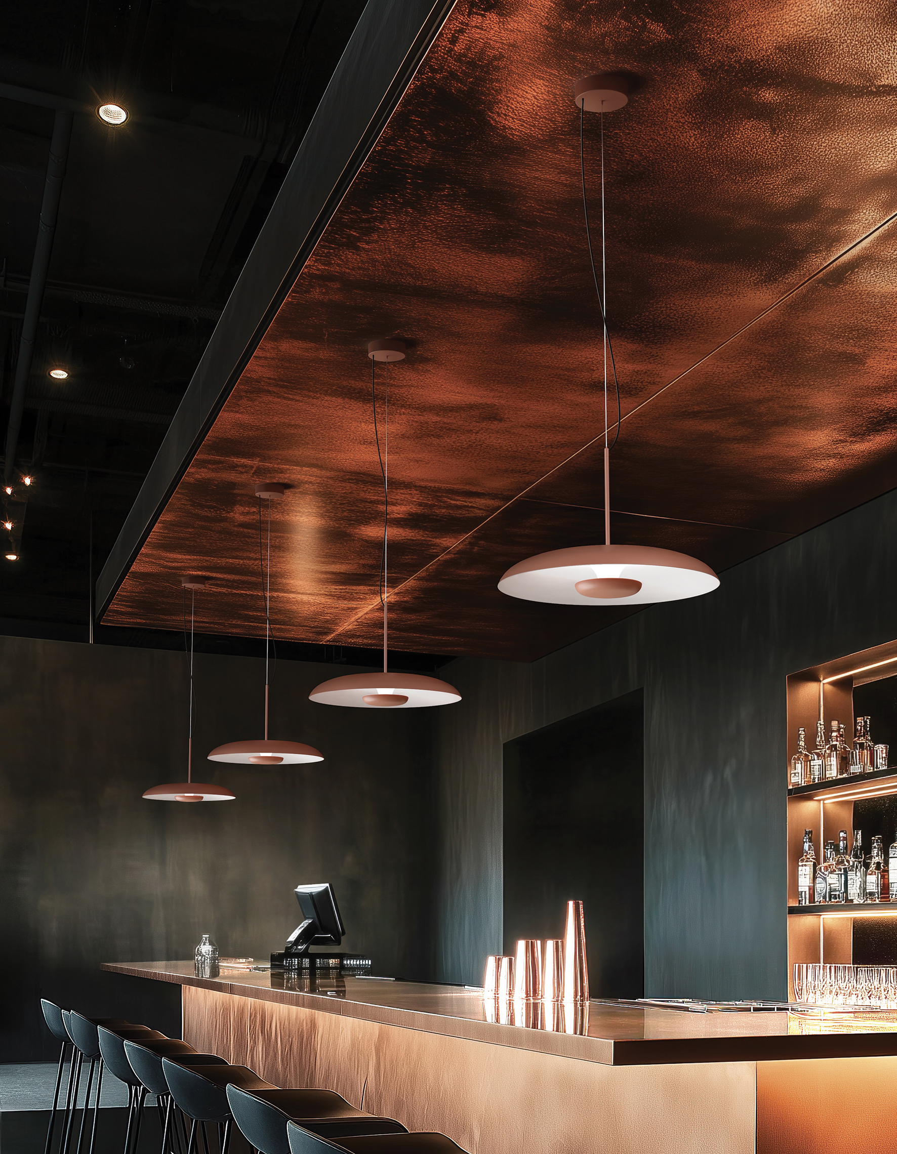 The Basin family combines essential design, functionality, and aesthetic care in two versatile models: Basin_S, a ceiling-mounted light, and Basin_P, a pendant lamp. Both are ideal for contract, residential, and hospitality settings, thanks to their contemporary look. The body, made of painted aluminum with a textured finish, is available in white, black, peach, petrol, and deep blue, allowing for harmonious integration with any interior style. The matte white interior ensures a soft and even light, while the central detail, matching the lamp body color, adds visual balance and sophistication.