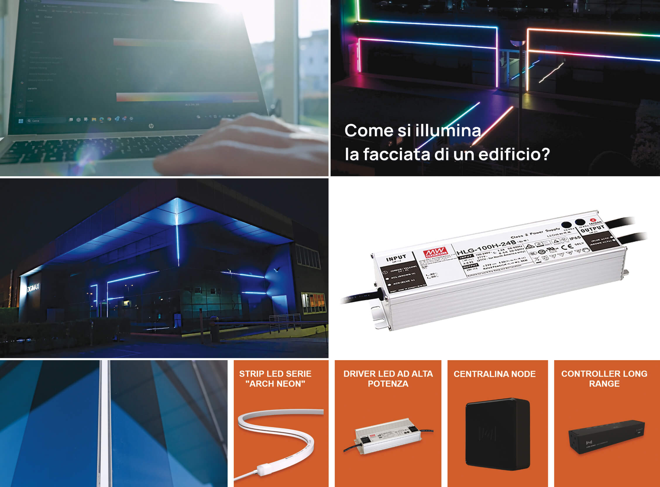 The lighting of buildings and facades represents the most interesting point of convergence between architecture, design, and lighting technology; the goal of these projects rarely stops at simple lighting, but rather focuses on enhancing the shapes and details of the structure, strengthening its identity, and memory. Clearly defining the aims of the intervention is, therefore, the first point to be firmly defined to ensure a correct choice of solutions and technologies used, including light sources, power supplies, optics and control technologies.