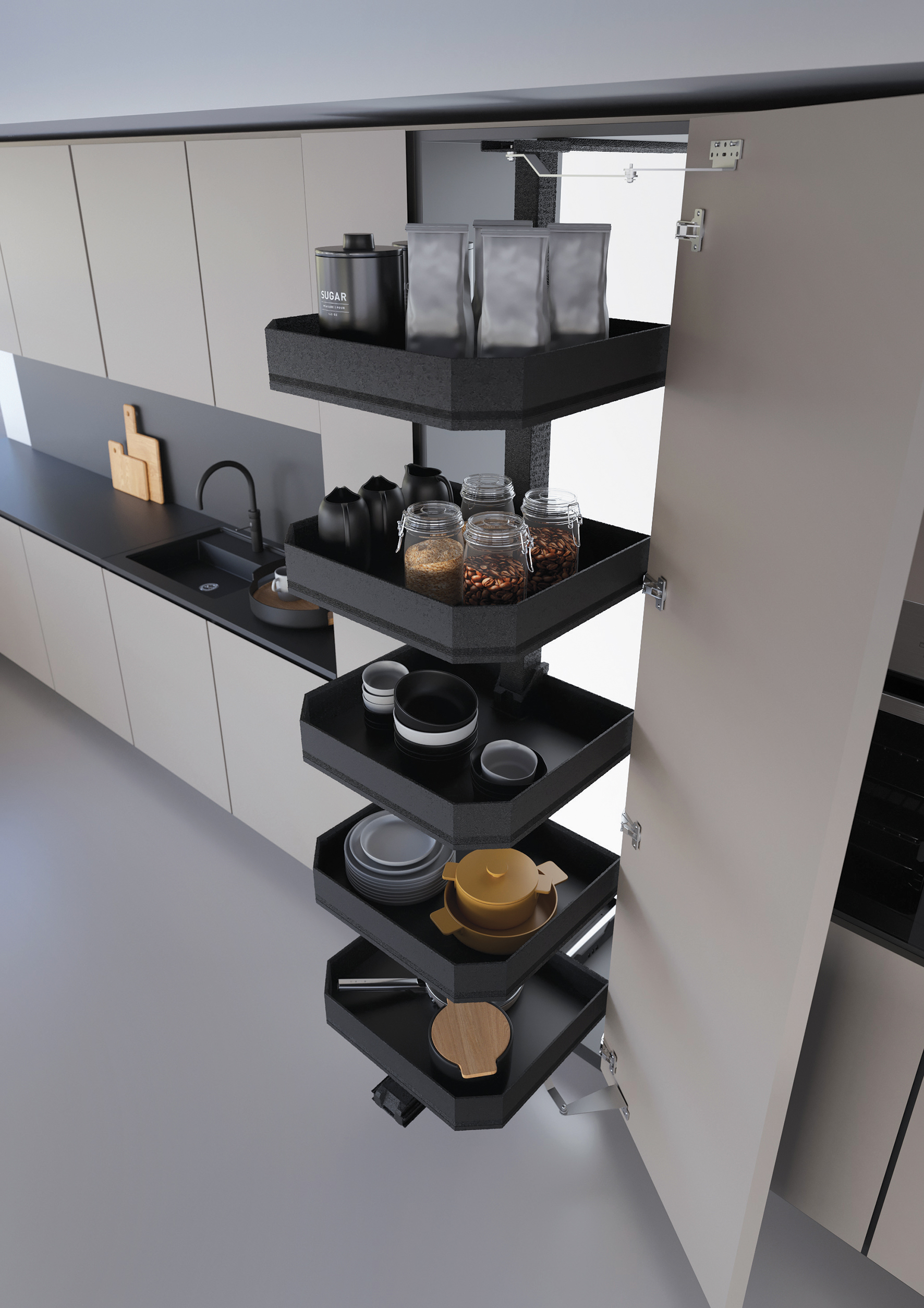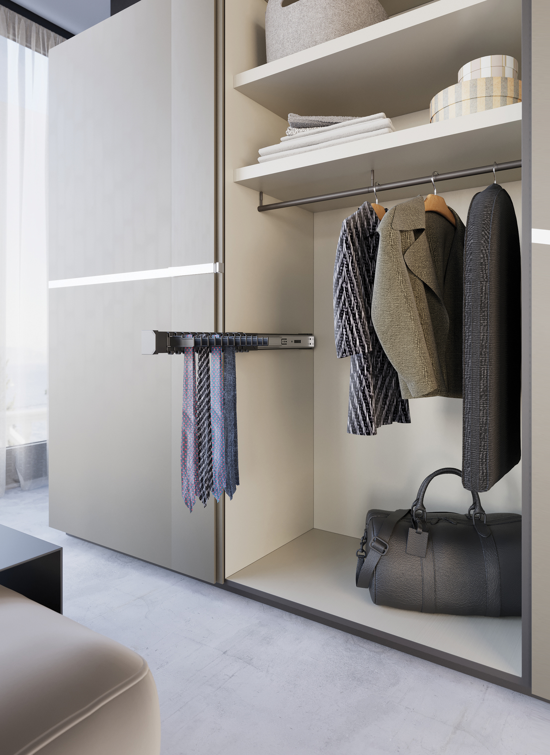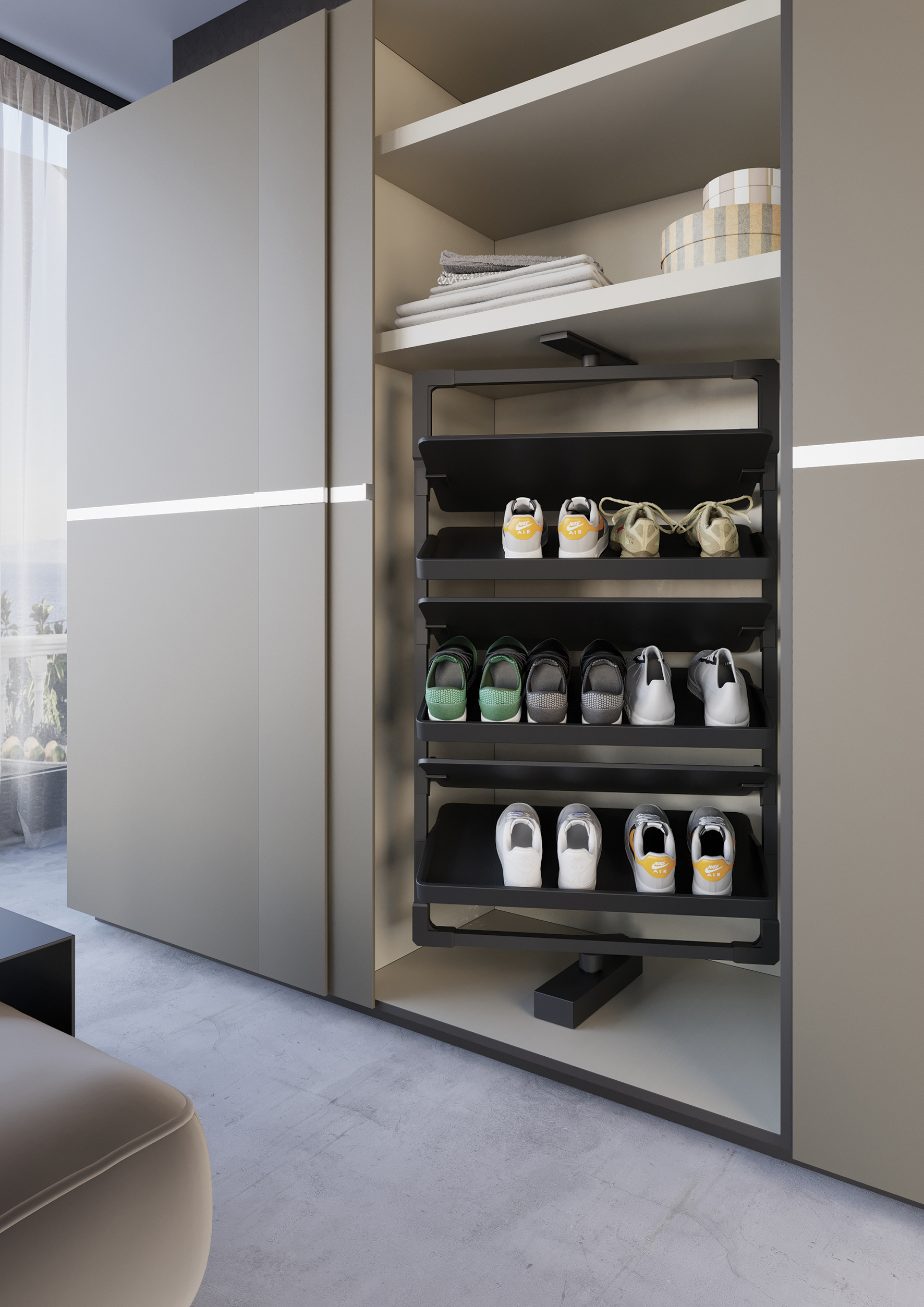 Per arredare, l’armadio Inoxa ha considerato portabiancheria, porta scarpe, porta pantaloni, porta oggetti e sacchi portabiancheria in cotone trapuntato; per tutti questi prodotti è previsto il telaio telescopico, mentre i contenitori possono essere in lamiera verniciata ed in filo metallico verniciato; anche per questa collezione Inoxa si è affidata ai sistemi di estrazione Grass e Salice.