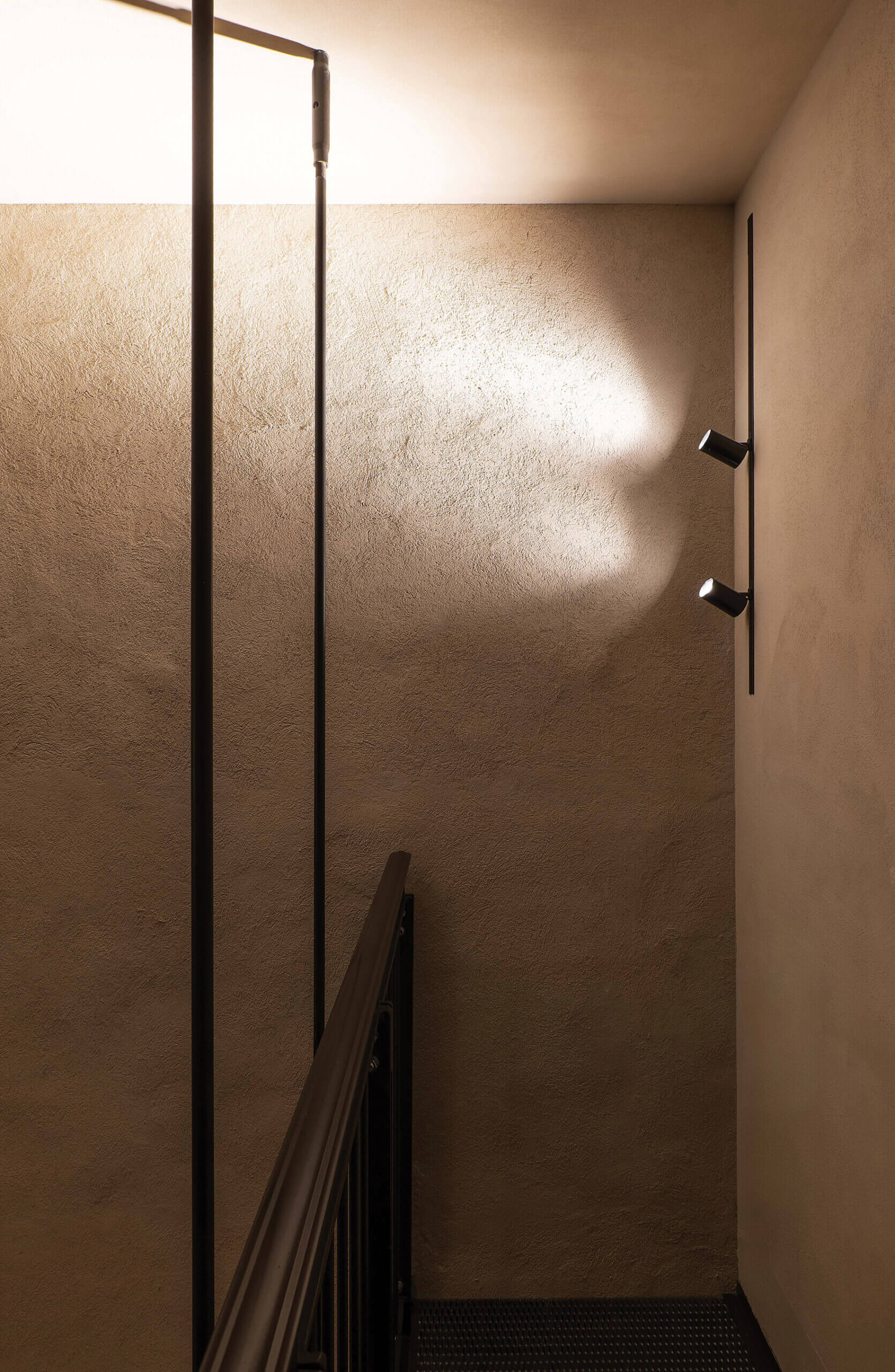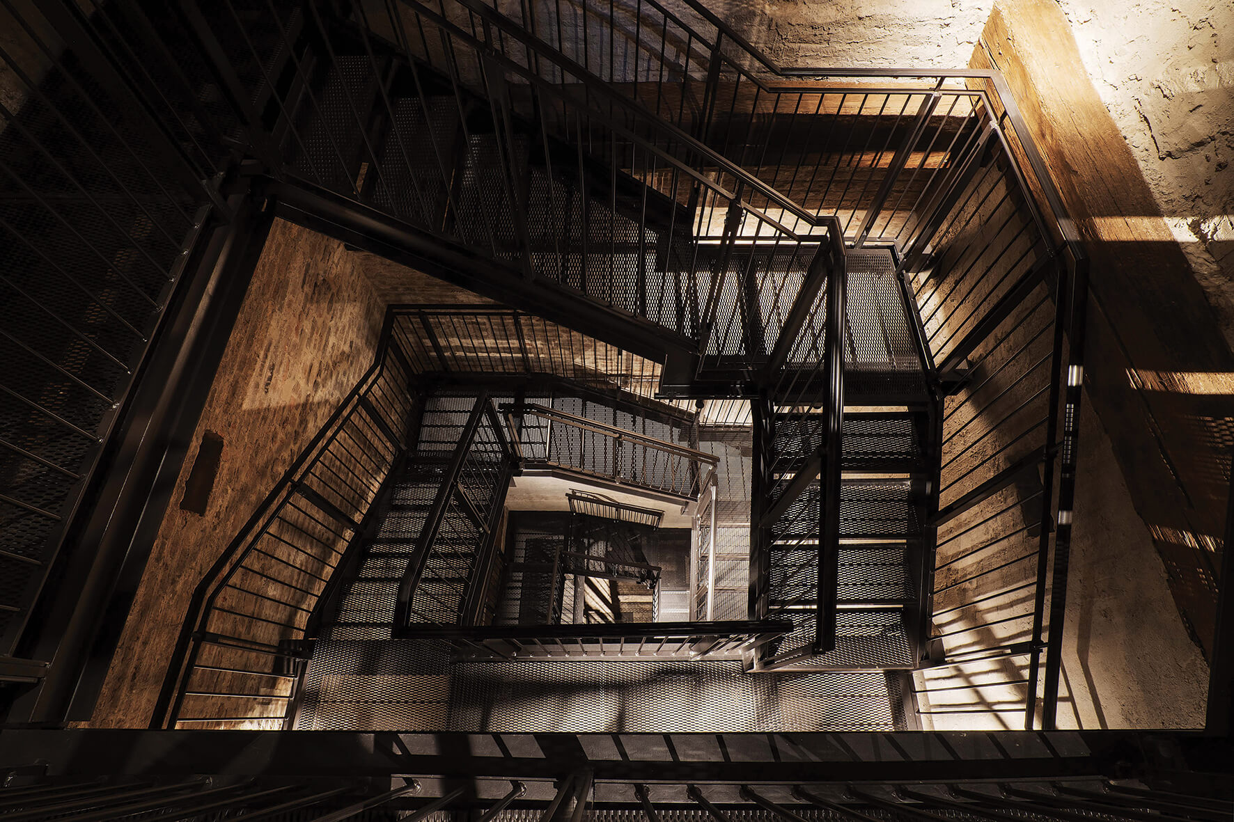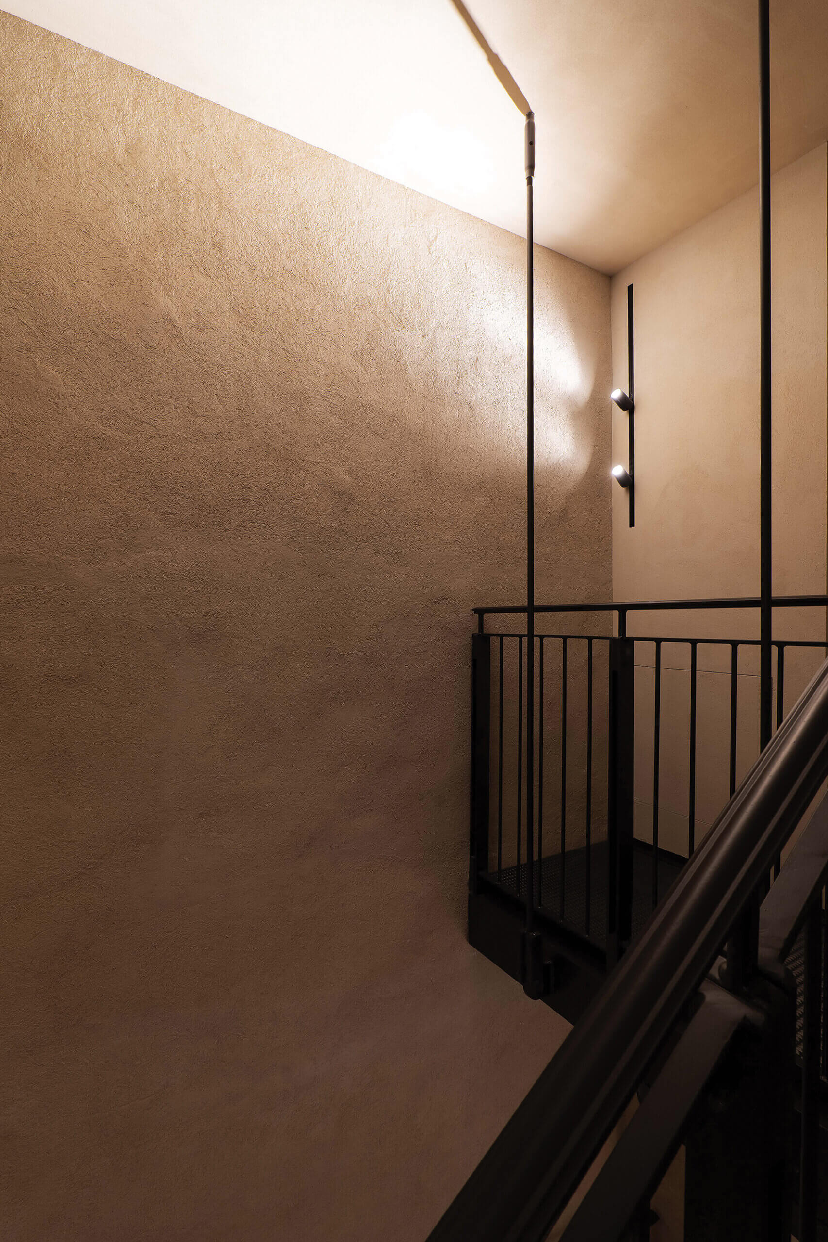 Il corpo scala studiato dallo studio Architettura Tommasi costituisce il cuore della trasformazione. La soluzione originaria in legno è stata sostituita da una struttura in ferro in conformità alle prescrizioni antincendio. L’inserimento della nuova scala ha richiesto un intervento strutturale particolarmente sofisticato che ha previsto consolidamenti interni con catene e tiranti di nuova generazione; cerchiature in acciaio per garantire stabilità alle murature storiche; carotaggi e rinforzi puntuali per integrare la scala nella volta portante; pulitura e levigatura delle superfici interne, mantenendo leggibili le tracce storiche, incluso il consolidamento del 17 gennaio 1940, ancora visibile all’ingresso. Grande attenzione è stata dedicata anche alla campana storica, che è stata temporaneamente movimentata mediante martinetti per permettere il passaggio della scala sino alla quota massima praticabile.